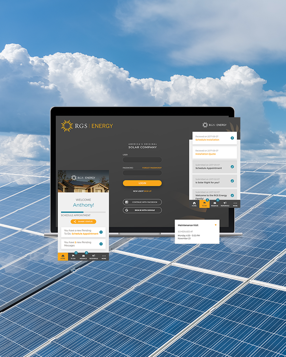 RGS Energy’s sales, installation, and service processes relied on numerous disconnected tools, manual handoffs, and siloed communication across teams. Customers struggled to understand where they were in the solar journey, leading to repeated calls, missed appointments, and delays. Internally, Sales Reps, Project Coordinators, Technicians, and Installers all needed different information and varying times, but no shared system existed to keep the experience consistent and transparent. RGS needed a unified digital solution that could simplify operations, reduce friction, and keep everyone aligned from first contact through long-term system ownership.
